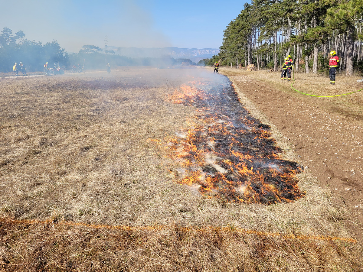 Um kontrolliertes Abbrennen im wissenschaftlichen Kontext erproben zu können, wurde in enger Abstimmung und Zusammenarbeit mit Bezirksförster Georg Heinz von der Forstbehörde Neunkirchen und den Feuerwehren des Unterabschnitts St. Egyden am Steinfeld Anfang März ein Brandversuch durchgeführt. Mit freundlicher Zustimmung der Grundstückseigentümer, der Agrargemeinschaft Saubersdorf, konnten auf der sogenannten „Saubersdorfer Trift“ drei Flächen für das kontrollierte Abbrennen ausgewählt werden. Bei zwei Testflächen mit jeweils ca. 600 m² handelte es sich um Wiesenflächen, die dritte, eigentliche Versuchsfläche betrug 2000 m² und war mit Sträuchern und Jungbäumen bewachsen. Folgende Ziele wurden im Vorfeld formuliert: